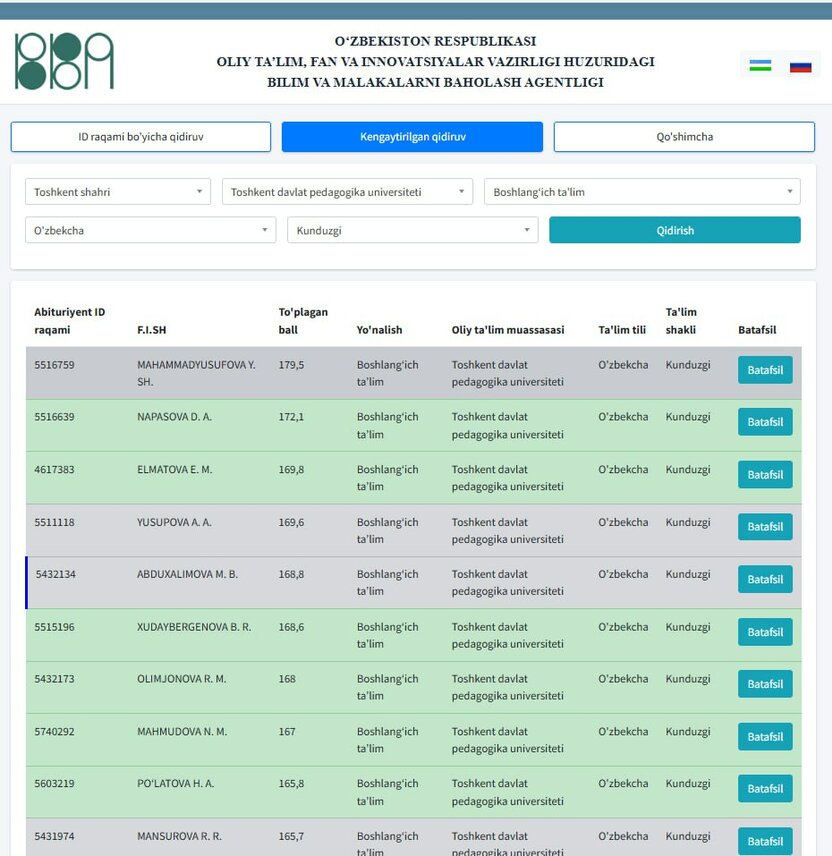 Abituriyentlar nechanchi o‘rinda turganini ko‘rishi mumkin