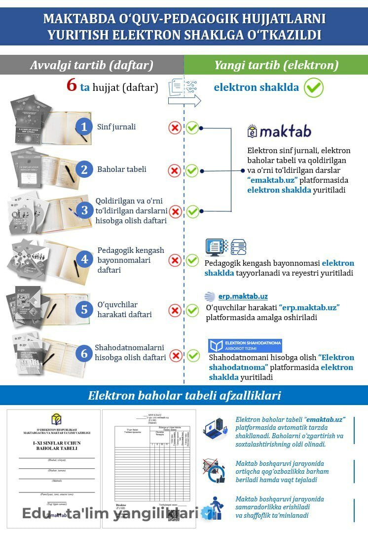 Xususan, elektron baholar tabeli “emaktab.uz” platformasida avtomatik tarzda shakllanadi va ota-onalar uchun tizimdan yuklab olish imkoniyati yaratiladi.