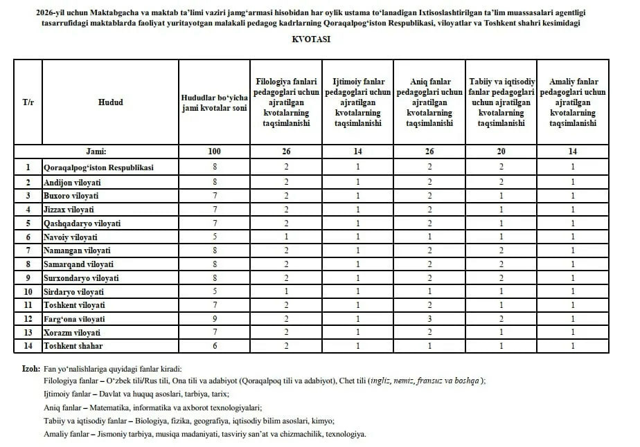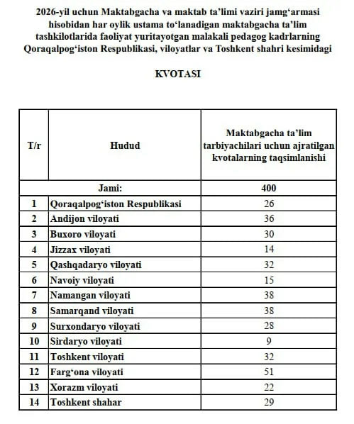 Maktabgacha va maktab ta’limi vaziri jamg‘armasi hisobidan 2026-yilda har oylik ustama oladigan malakali pedagog kadrlar uchun hududlar va yo‘nalishlar kesimida kvotalar taqsimoti belgilandi.