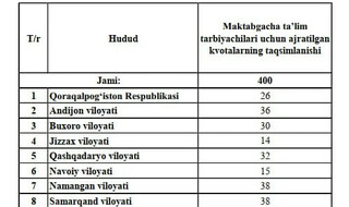 Maktabgacha ta’lim tashkilotlari (bog‘chalar) uchun: 400 ta kvota.